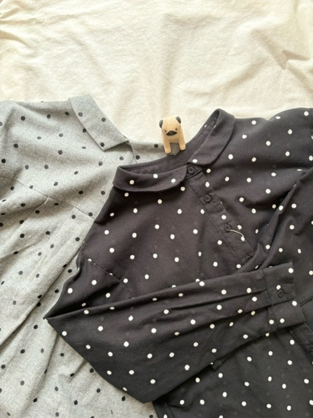 起毛をかけた無地の綿生地全体にドットの刺繍を施したブラウス ドットが遠くから見るとポコポコと浮きだって見えてコーディネイトのアクセントに 前襟は丸襟で、後ろは割れ襟でポイントに 後ろ背中中央にプリーツのようなタックが入って羽織としても クルミボタンも上品な印象に 細かいデティールが活きるシャツです シンプルなコーディネイトに羽織るだけでインパクトのあるコーディネイトになります 起毛素材なので暖かく柔らかい肌触りで着心地良く着用いただけます お家でお洗濯できます グレー生地はブラックドット ブラック生地はホワイトドット model : 158cm <素材> 綿 100% <サイズ> 着丈 68cm
