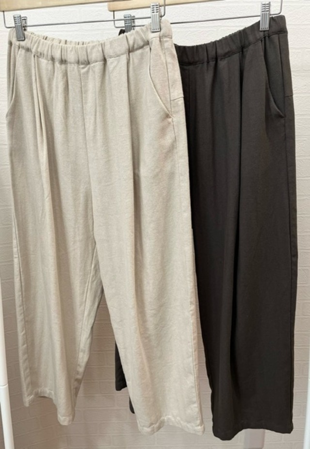 太番手の糸で織られたへリンボン生地のパンツ 同素材のベストとセットアップで着用いただけます 無地ですが、へリンボン織なのでストライプのように見えるオシャレパンツ ウエストゴム仕様で紐でウエストを絞って着用いただけます ウエストゴム下の前左右にタックが入り、ふんわりと広がるシルエット ゆるっとパンツを穿きたい方にピッタリです 後ろポケットから覗く配色もとってもオシャレ ベージュのポケット配色はダークグレー ダークグレーのポケット配色はベージュです カラーはブラウンにも見えるダークグレーと、薄いベージュの2色展開です お家でお洗濯できます model : 158cm <素材> 本体 : 綿 100% , 別布 : 綿 100% <サイズ> パンツ丈 90cm