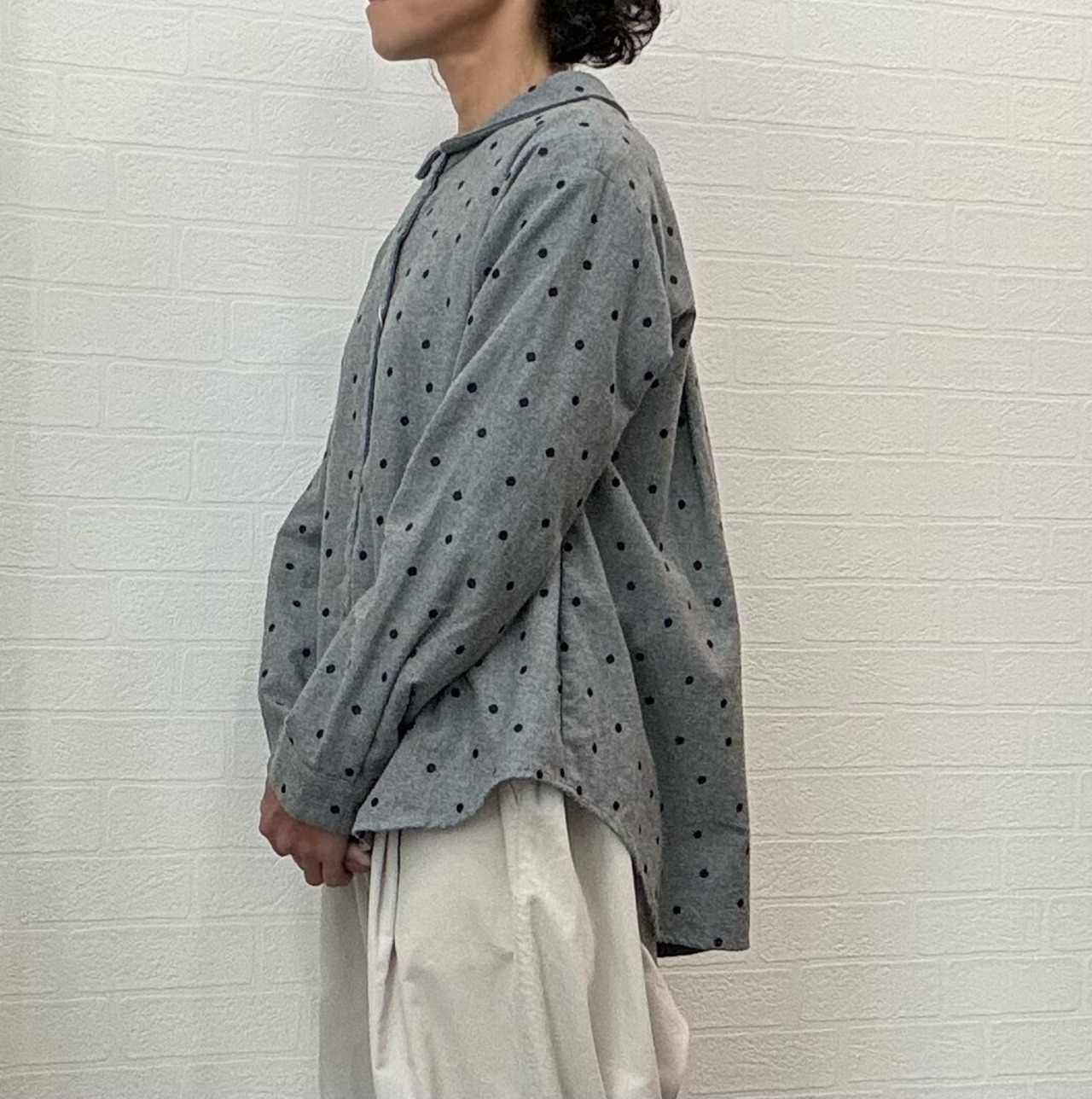 起毛をかけた無地の綿生地全体にドットの刺繍を施したブラウス